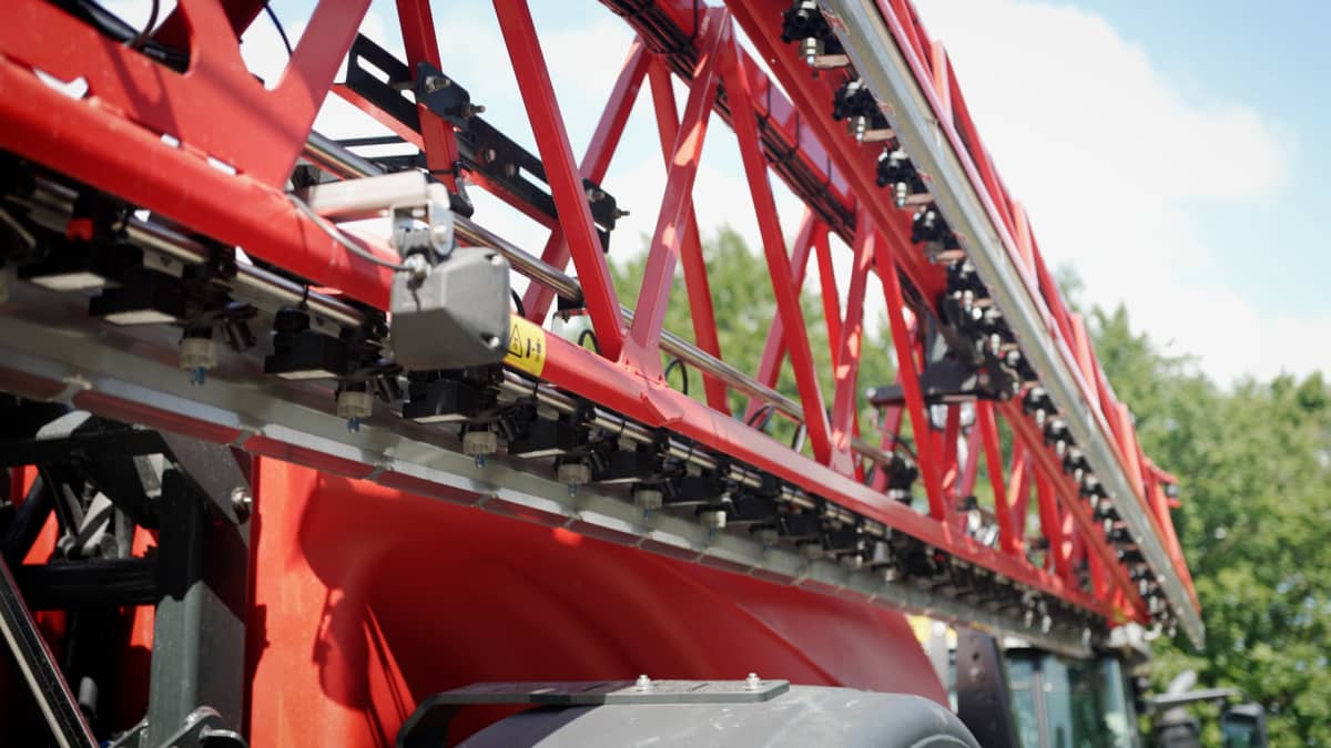 Even later demonstreert Van der Heijden de spuit op een perceel. Met schoon water in de tank laat hij zien hoe de machine werkt. De machine is uitgerust met het balanssysteem BoomGuide Pro Active. Dat bestaat uit boomhoogtesensoren die de hoogte van de boomdelen links en rechts onafhankelijk corrigeren, zowel positief als negatief. Bovendien wordt er vanuit het middendeel proactief gecorrigeerd, bijvoorbeeld wanneer de sensor meet dat het wiel iets wegzakt in een spuitspoor. Het middendeel corrigeert dit vooraf door die kant iets hoger te brengen.